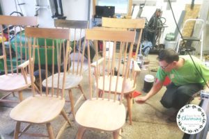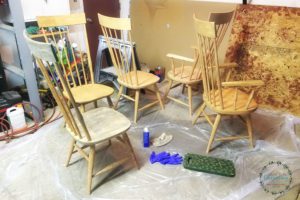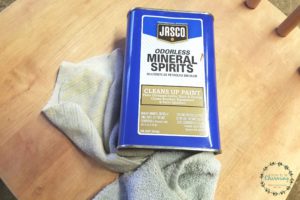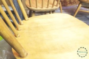 It is finally time to get the chairs cleaned and ready for painting! Use mineral spirits for this step. I grabbed an old rag and poured on the mineral spirits. I wiped every chair down and it’s amazing how well mineral spirits work to remove any debris or dust left on the chairs.
