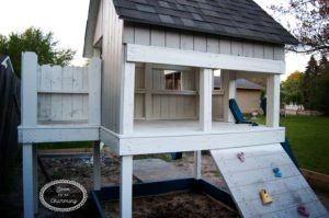 To finish our look, we trimmed out the windows, added flowerboxes my husband built and I purchased flowers at a local craft store. We also mounted the Plexiglas windows I made (click Here for a full tutorial on Colorful Plexiglas Windows ). We placed black rubber mats under the swings, the slide and the ladder to keep those spots from getting muddy or getting big indents under them.