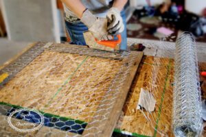 In the middle of the frame I wanted chicken wire. So I bought 1″ mesh chicken wire and rolled it out on the backside of the frame. I stapled two of the sides and then trimmed the wire.
